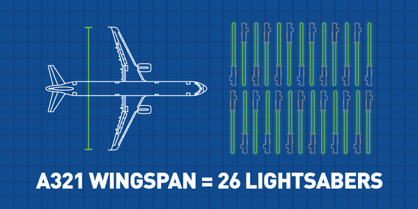 The wingspan of a JetBlue Airbus A321 is roughly the length of 26 lightsabers. #MayThe4thBeWithYou #ThePlaneTruth